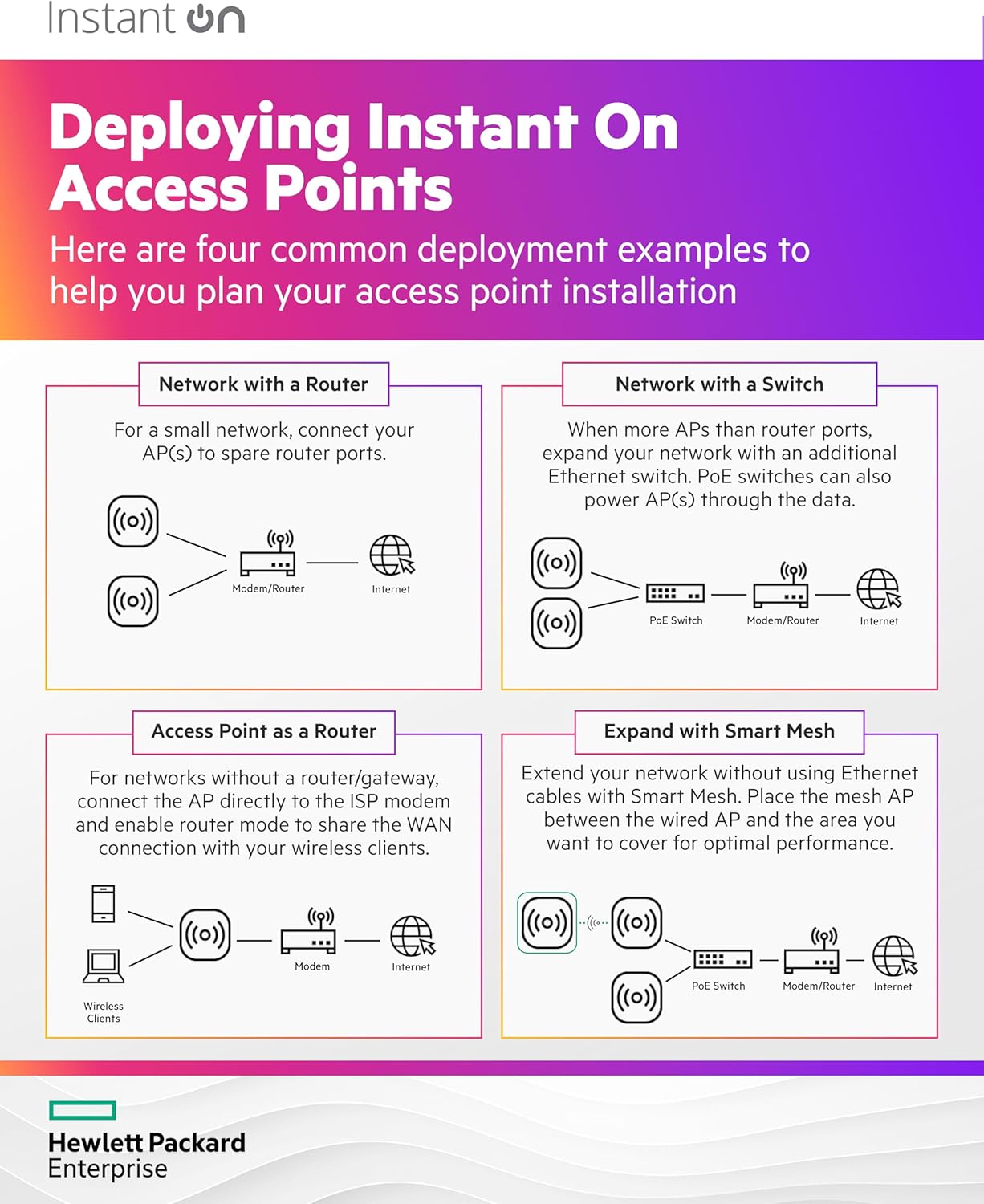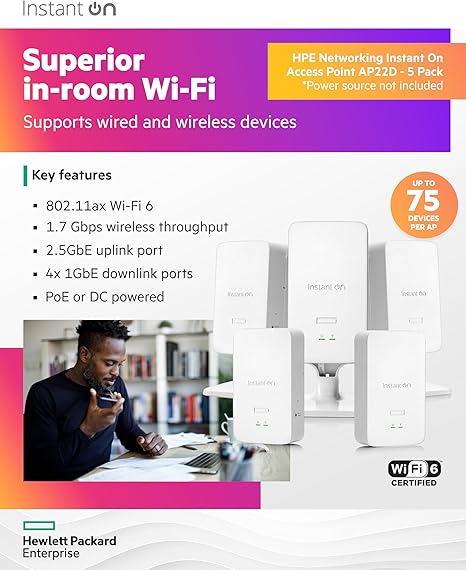 This single, sleek form-factor houses four 1 gigabit Ethernet ports for wired devices and an 802.11ax 2×2 Wi-Fi Certified 6™ access point that uplinks through a 2.5 gigabit Ethernet port. Mount the HPE Networking Instant On Access Point AP22D on a desk for easy access to the built-in Ethernet ports or on the wall near wired devices to blend into any environment.