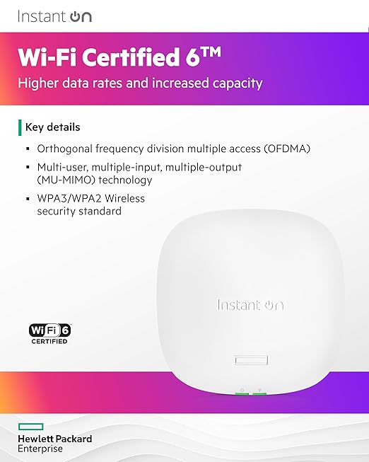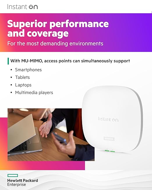 With HPE Networking Instant On Access Point AP25, get faster Wi-Fi speeds, greater capacity, and reduced latency between access points and devices for a superior Wi-Fi experience.