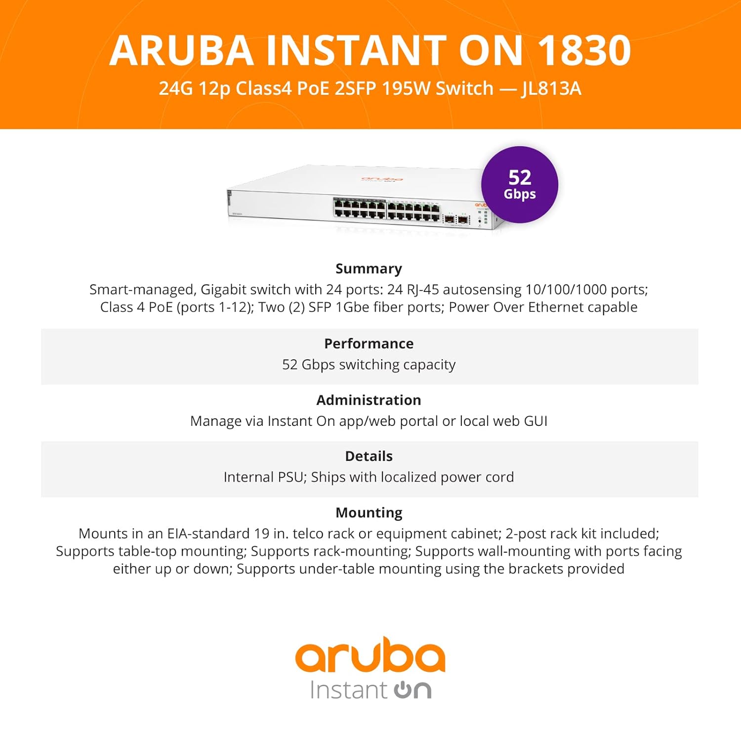 Aruba ION 1830 24-Port Gigabit PoE Switch with 2x SFP 1GbE Ports | 195W Class 4 PoE | 52Gbps Switching Capacity | 38.68 Mpps Throughput | ARM Cortex-A9 Processor