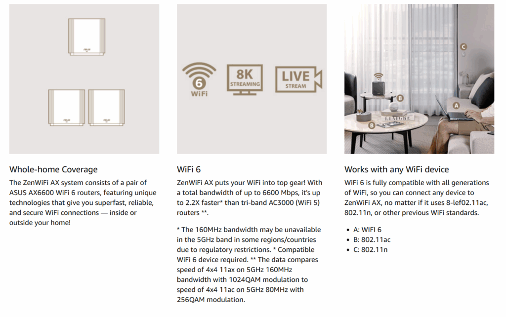 AX6600 Tri-Band WiFi 6 System – Combined speeds up to 6.6 Gbps (574 + 1201 + 4804 Mbps).