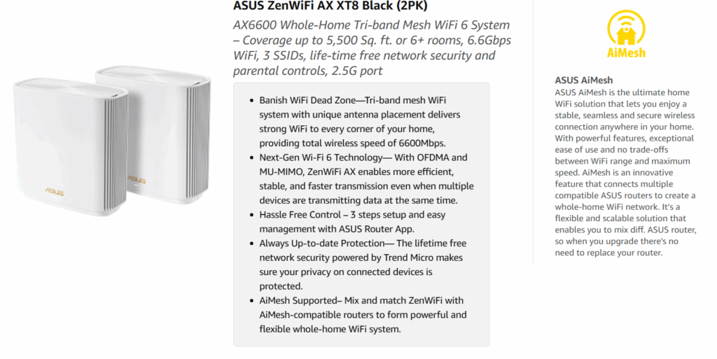 ASUS AX XT8 White 2 Pack (XT8-WHITE-2PK) system supports AiMesh, allowing you to mix and match with other ASUS AiMesh-compatible routers to create a flexible and powerful mesh network. With lifetime free AiProtection Pro security powered by Trend Micro, WPA3 encryption, and advanced parental controls, your family’s privacy and safety are always protected.