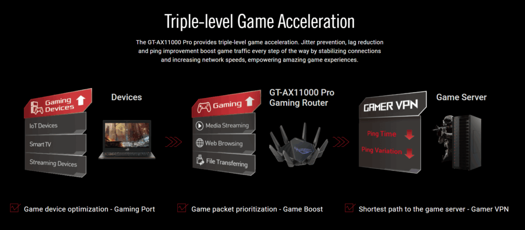 The ASUS GT-AX11000-PRO model integrates ASUS RangeBoost Plus technology for drastically improved WiFi coverage and signal strength, reducing dead zones across large homes or gaming setups. the ASUS GT-AX11000-PRO triple-level game acceleration mechanism optimises the network traffic pathway from your device to game servers, minimising jitter, lowering ping, and accelerating data packets to maintain seamless gameplay performance.