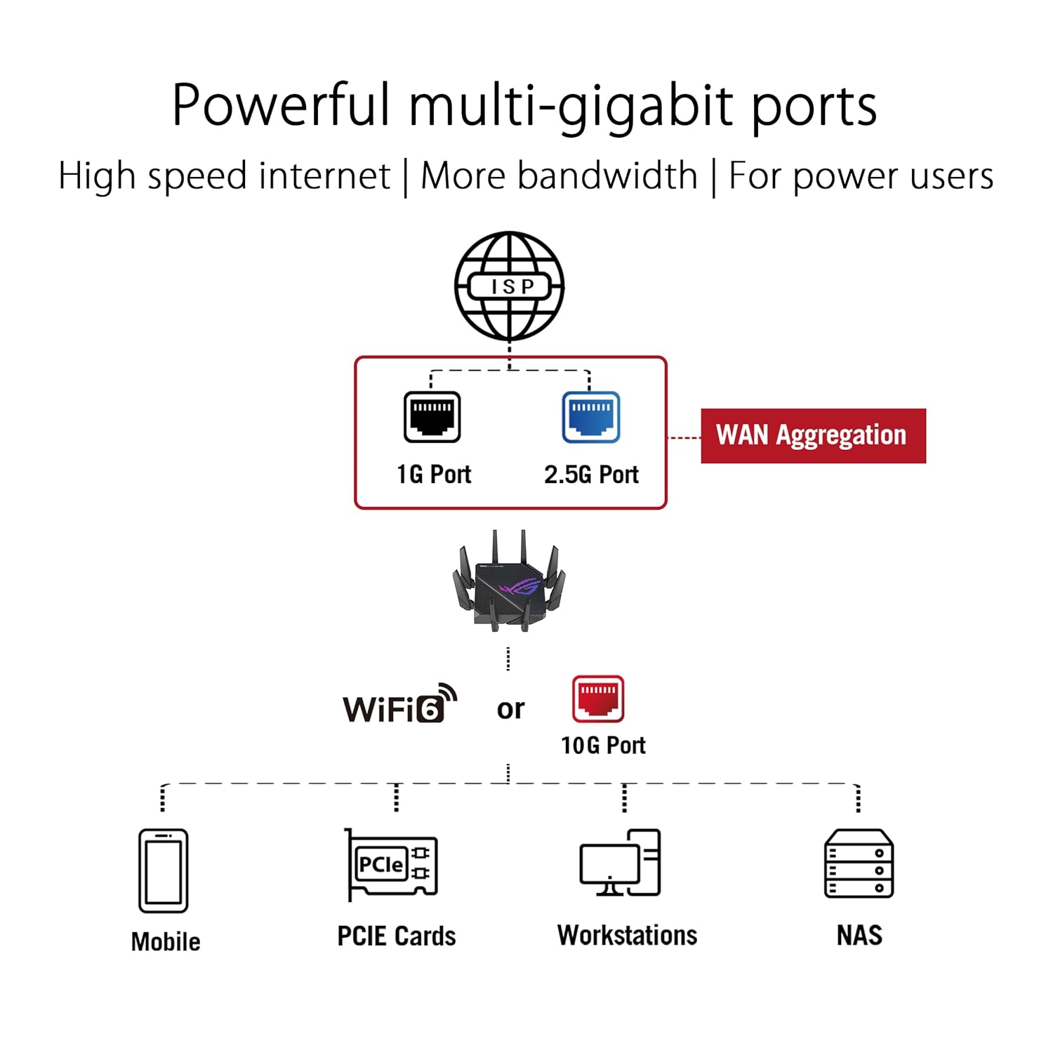 Powered by a 2.0 GHz 64-bit quad-core processor coupled with 1GB DDR4 RAM and 256MB NAND flash memory, the ASUS GT-AX11000 PRO enables superior wireless signal processing and network management capabilities. The ASUS GT-AX11000-PRO router features flexible, multi-gigabit connectivity options, including one 2.5 Gbps WAN port and one ultra-fast 10 Gbps WAN/LAN port, which can be configured to meet different networking requirements, such as high-speed internet access or local device connection aggregation.