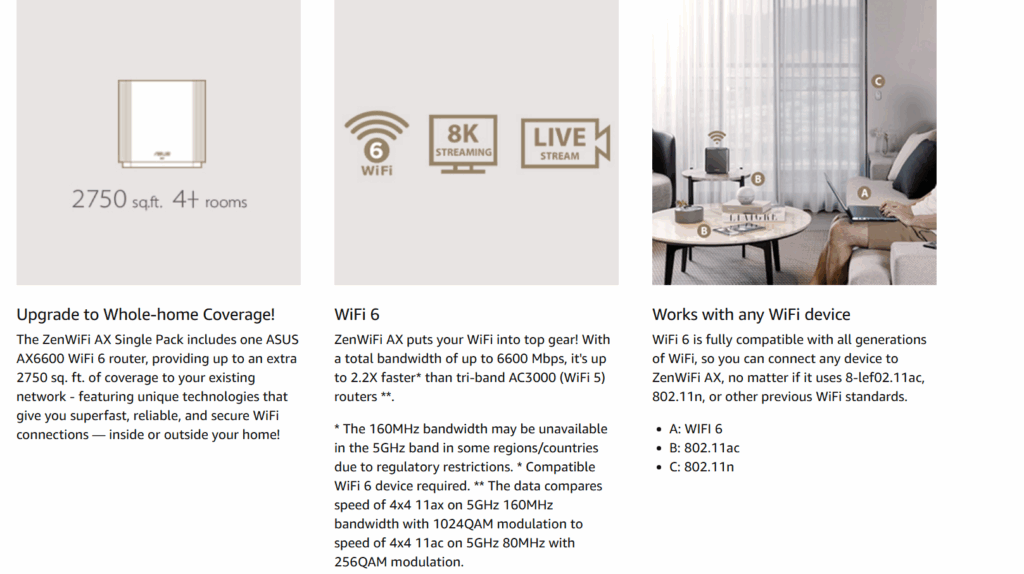 The ASUS ZenWiFi AX XT8Â (White, 1-Pack) XT8-WHITE-1PK is a premium WiFi 6 router that delivers lightning-fast AX6600 Tri-Band speeds and wide coverage, making it perfect for large homes and modern smart living. ASUS ZenWiFi AX XT8 is combining 574 Mbps (2.4 GHz), 1201 Mbps (5 GHz-1), and 4804 Mbps (5 GHz-2), it ensures a total throughput of up to 6600 Mbps for 4K/8K streaming, gaming, and heavy multi-device usage.