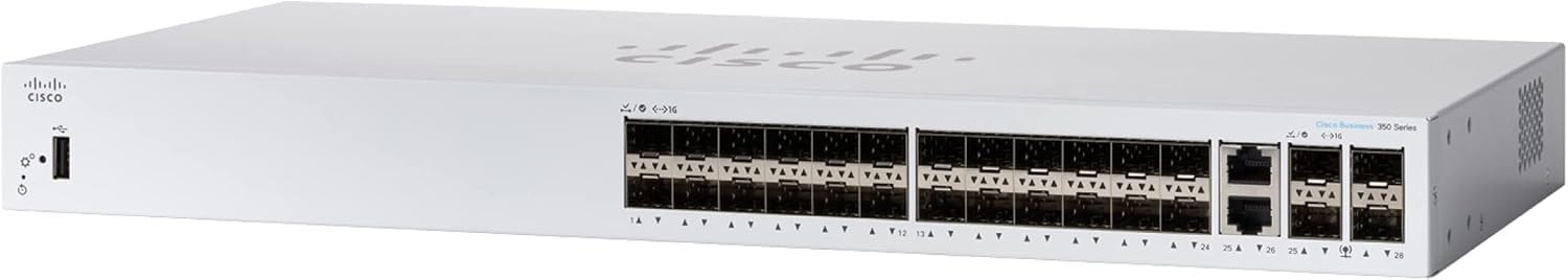 The Cisco Business CBS350-24S-4G model offers flexibility with 28 total expansion slots, including modular SFP ports for mixed media support (fiber and copper), making network upgrades and expansion hassle-free. Cisco Business CBS350-24S-4G is designed to be versatile in mounting options—desktop, wall, or rack mountable—fitting into various deployment scenarios easily.