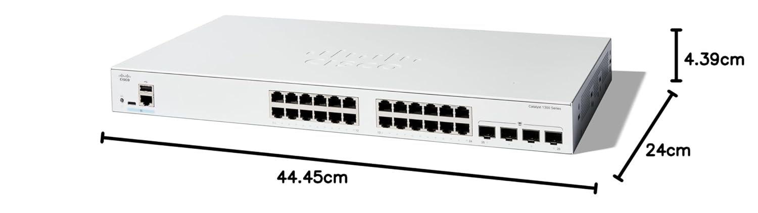 The Cisco Catalyst C1300-24T-4G is a robust and reliable managed Gigabit Ethernet switch tailored for small to medium-sized businesses. Designed to deliver high-speed connectivity and seamless network performance, The Cisco Catalyst C1300-24T-4G features 24 auto-sensing 10/100/1000 Mbps ports complemented by 4 additional 1G SFP uplink ports, allowing for flexible and extended network reach through fiber connectivity. The Cisco Catalyst C1300-24T-4G fanless design ensures silent operation, making it ideal for office environments.