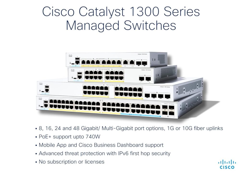The Cisco Catalyst C1300-48T-4G is a high-density, fixed-configuration managed Gigabit Ethernet switch designed for small and medium-sized businesses and enterprise-edge deployments. The Cisco Catalyst C1300-48T-4G provides 48 auto-sensing 10/100/1000 Mbps Ethernet ports, delivering robust and scalable connectivity for demanding network environments. In addition, The Cisco Catalyst C1300-48T-4G includes 4 Gigabit SFP fiber uplink ports to enable flexible network expansion and integration with higher-speed cores or fiber backbone infrastructure.