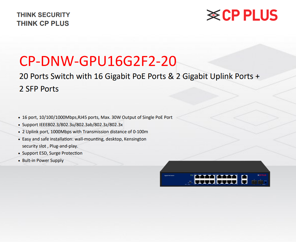 The CP PLUS CP-DNW-GPU16G2F2-20 is a 16 port Gigabit PoE switch with 2 Gigabit RJ45 uplink ports and 2 SFP ports. It supports IEEE 802.3af/at with a 200W PoE budget and built-in AC power supply.