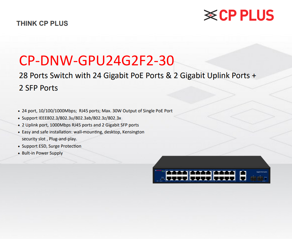 The CP PLUS CP-DNW-GPU24G2F2-30 is a 28-port Gigabit Ethernet PoE switch equipped with 24 × 10/100/1000 Mbps PoE RJ45 ports delivering up to 30 W per port with a total PoE power budget of 300 W, along with 2 × 1000 Mbps RJ45 uplink ports and 2 × Gigabit SFP ports for fiber connectivity.