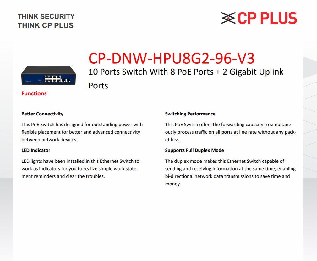 The CP PLUS CP-DNW-HPU8G2-96-V3 is an unmanaged PoE Ethernet switch designed to provide power and data connectivity to compatible wired network devices through standard RJ45 cabling.