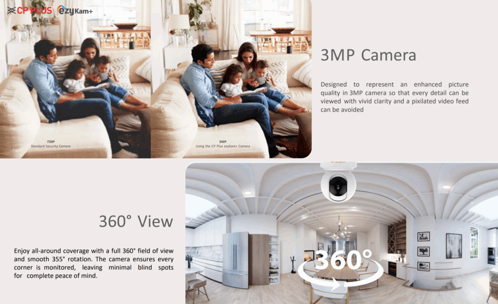 CP Plus CP-E31Q 3MP indoor PT camera delivers sharp 3MP video, 355° pan & 71° tilt, 15m IR night vision, two‑way talk, and sound detection alerts. Featuring H.265 compression, microSD support, and Google Home integration, it’s an efficient, easy‑to‑use home security camera.