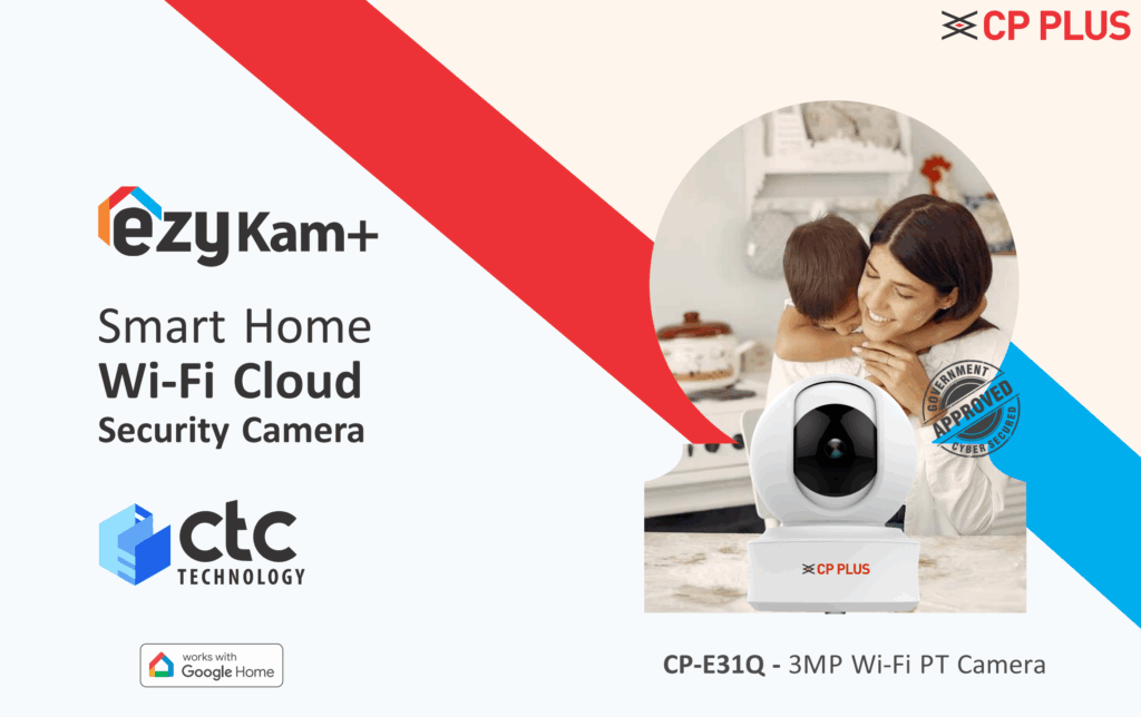 CP Plus CP-E31Q 3MP indoor PT camera delivers sharp 3MP video, 355° pan & 71° tilt, 15m IR night vision, two‑way talk, and sound detection alerts. Featuring H.265 compression, microSD support, and Google Home integration, it’s an efficient, easy‑to‑use home security camera.