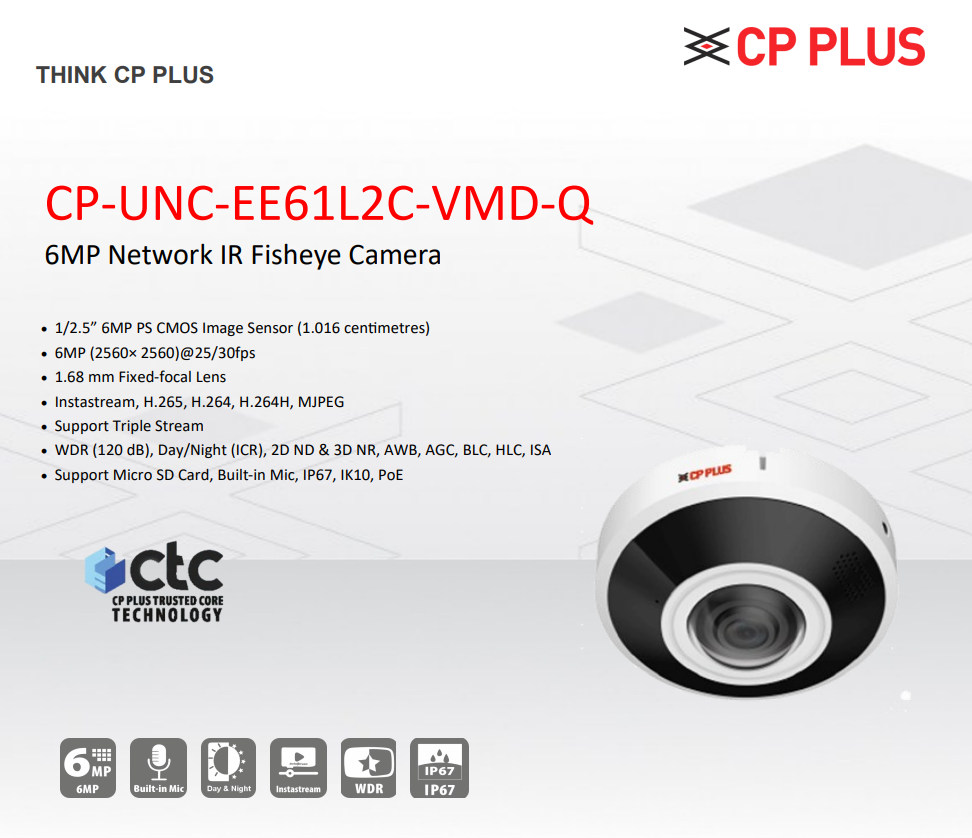 The CP Plus CP-UNC-EE61L2C-VMD-Q Ultra Vision Series 6MP Network Camera delivers exceptional panoramic surveillance with precision, performance, and AI efficiency. Engineered with a 1/2.5” 6MP Progressive Scan CMOS image sensor, this camera provides superior 360-degree fisheye coverage at up to 2560 × 2560 resolution, ensuring complete situational awareness in indoor or outdoor installations.