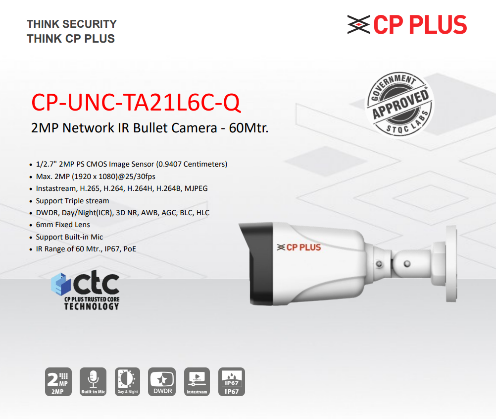 CP PLUS CP-UNC-TA21L6C-Q Additional functionalities include built-in microphone audio, Power over Ethernet (PoE) for easy power and data delivery through one cable, and high-level cybersecurity with AES 256-bit encryption. Ideal for homes, retail stores, and enterprises, this camera delivers reliable, intelligent, and secure surveillance backed by CP PLUS’s Trusted Core Technology.