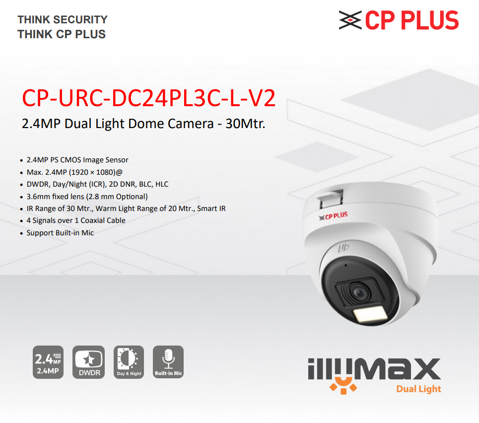 CP PLUS CP-URC-DC24PL3C-L-V2 is a 2.4MP Dual Light Dome Camera offering full-colour video in darkness with Smart Dual IR, multi-format HD output, built-in mic, and 30m night vision—perfect for reliable 24/7 surveillance.