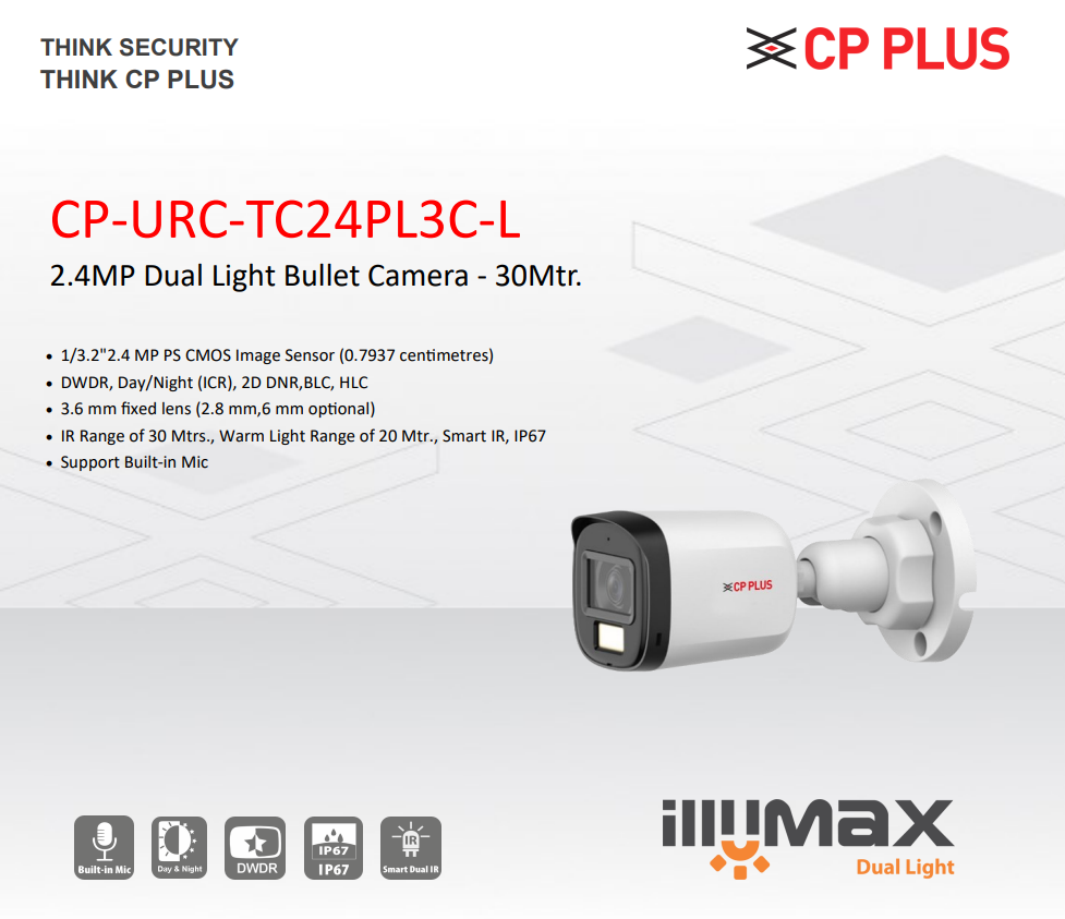 CP PLUS CP-URC-TC24PL3C-L The Illumax 2.4MP Dual Light Bullet Camera delivers full-color night vision, a 30m smart IR range, active deterrence, and versatile video format support, ensuring reliable, high-quality surveillance for indoor and outdoor security.