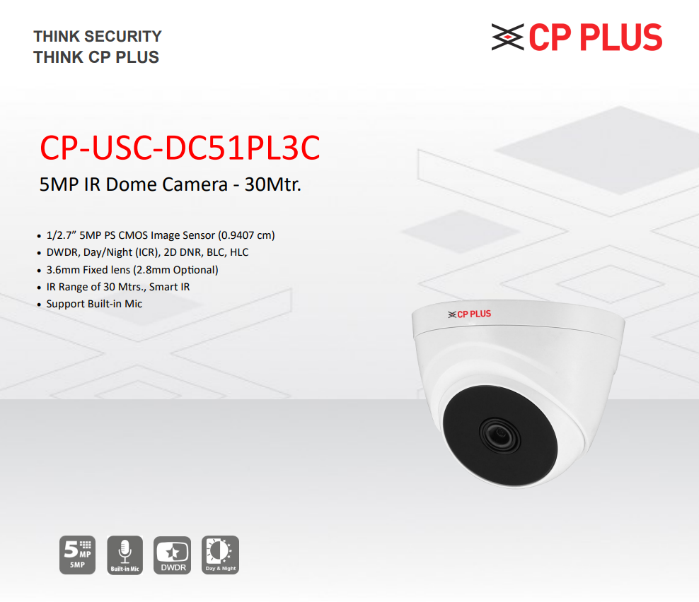 The CP PLUS CP-USC-DC51PL3C is a versatile 5MP IR Dome Camera featuring smart 30m IR, built-in mic, UNI tech support, and HD 2880×1620 resolution for exceptional surveillance in varied lighting conditions.
