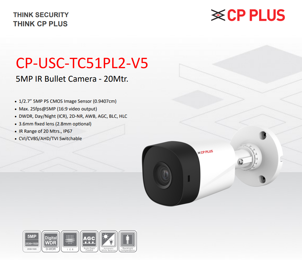 CP PLUS CP-USC-TC51PL2-V5 is a 5MP IR bullet camera featuring 20m night vision, IP67 weatherproof casing, and UNI technology for multi-format compatibility, delivering sharp HD video with advanced night and day surveillance capabilities.