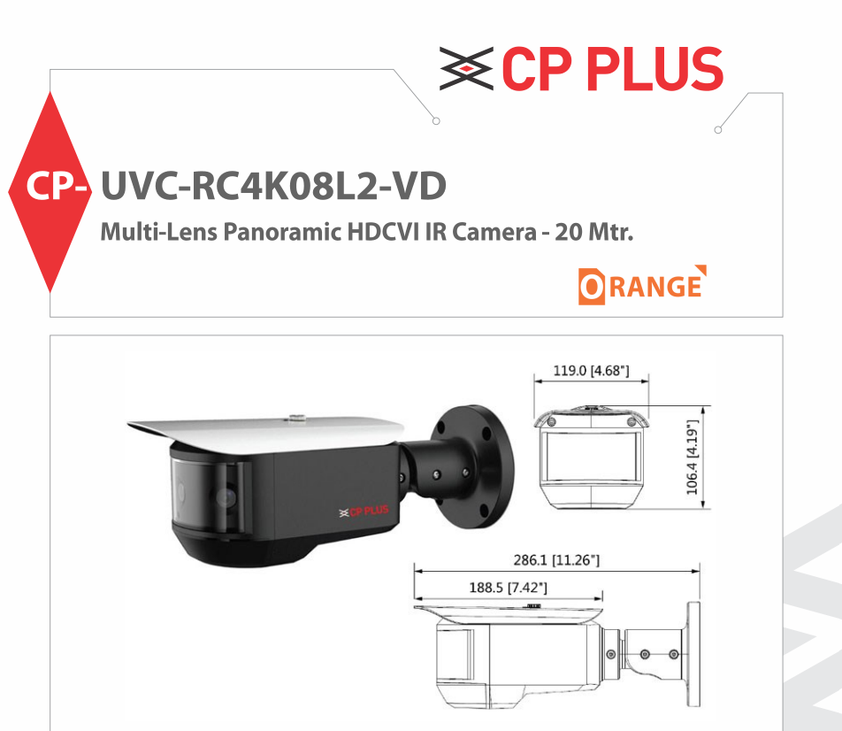 The CP PLUS CP-UVC-RC4K08L2-VD is a high-performance multi-lens panoramic HDCVI IR camera designed to deliver exceptional 4K surveillance quality. CP PLUS CP-UVC-RC4K08L2-VD model features three 12.8MP progressive scan CMOS image sensors providing a panoramic 4K resolution of 3840×832 pixels alongside three individual 2MP video streams. With a robust fixed 3.6mm lens and an infrared (IR) range of up to 20 meters, this camera ensures clear imaging even under low light conditions.