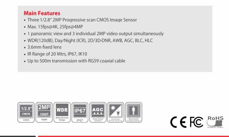 | Video Output | 1-channel panoramic HDCVI; 3-channel 2MP HDCVI |