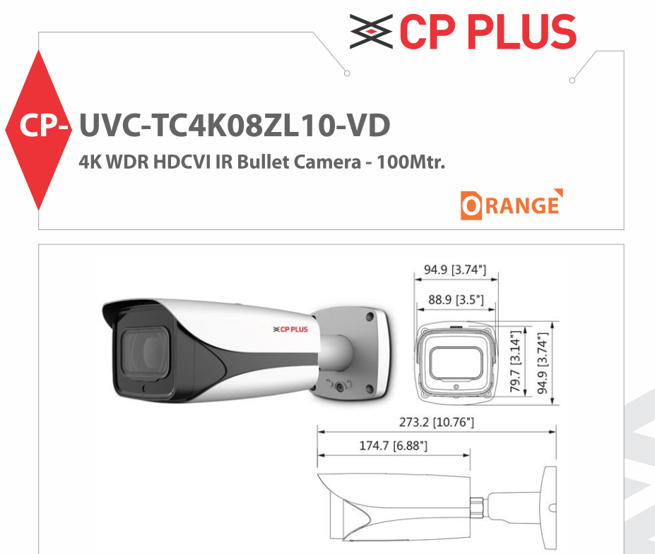 CP PLUS CP-UVC-TC4K08ZL10-VD offers 4K HD surveillance with 8MP resolution, 3x motorized zoom, 120dB WDR, 100m IR night vision, and IP67 weatherproof housing, ideal for reliable outdoor security monitoring.