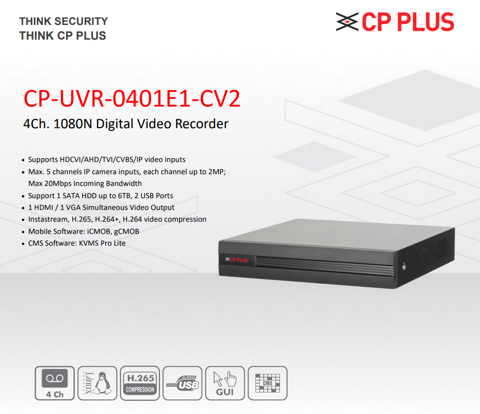 CP PLUS CP-UVR-0401E1-CV2 is a 4-channel 1080N DVR with H.265 compression, 6TB HDD support, multi-format auto-adapt, and mobile app control for seamless security monitoring.