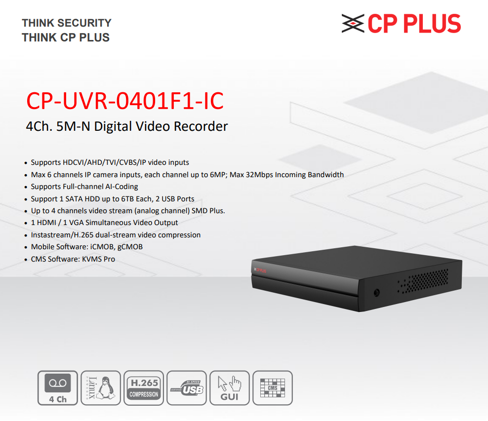 The CP-UVR-0401F1-IC features full-channel AI coding support, smart motion detection (SMD Plus) for human and vehicle classification, and simultaneous video output via HDMI and VGA ports. CP PLUS CP-UVR-0401F1-IC is complemented by the comprehensive CP PLUS software ecosystem, including mobile apps iCMOB, gCMOB, and KVMS Pro for hybrid video management, ensuring seamless device control and live video access.