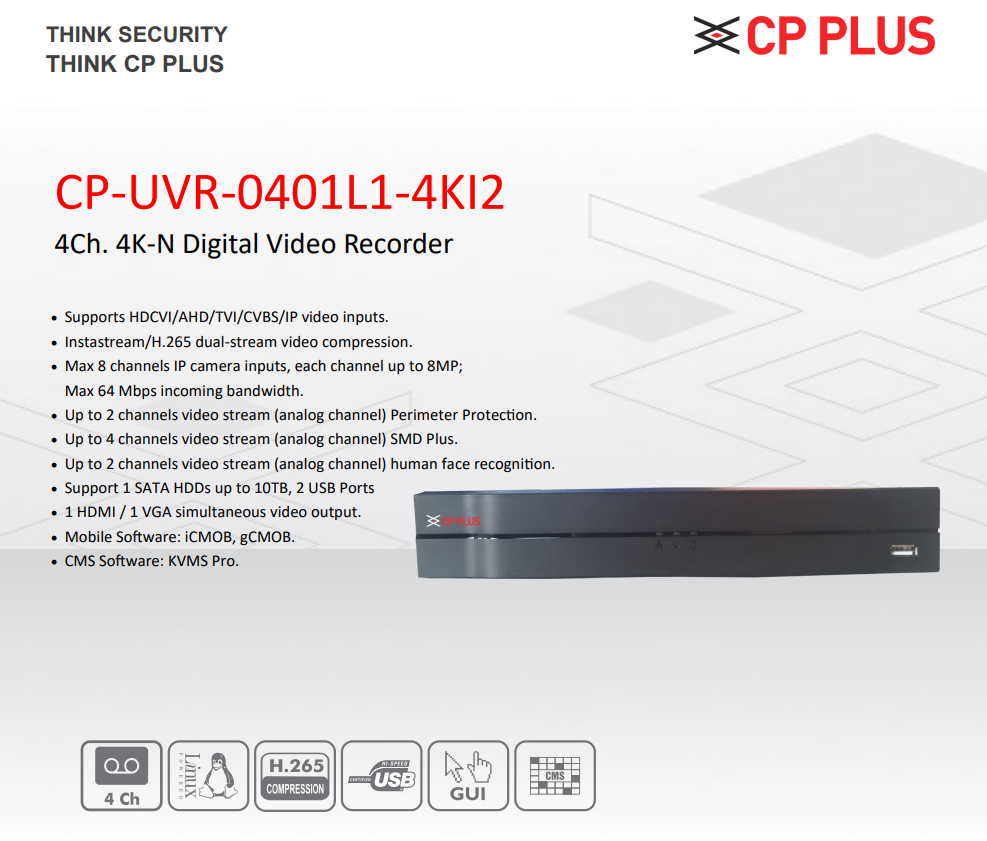 CP PLUS CP-UVR-0401L1-4KI2 DVR supports 1 SATA HDD of up to 10TB capacity and provides 2 USB 2.0 ports, plus simultaneous video output through HDMI and VGA interfaces for flexible display options. CP-UVR-0401L1-4KI2 integrates seamlessly with mobile apps like ICMOB and gCMOB, alongside the KVMS Pro CMS software for comprehensive remote management.
