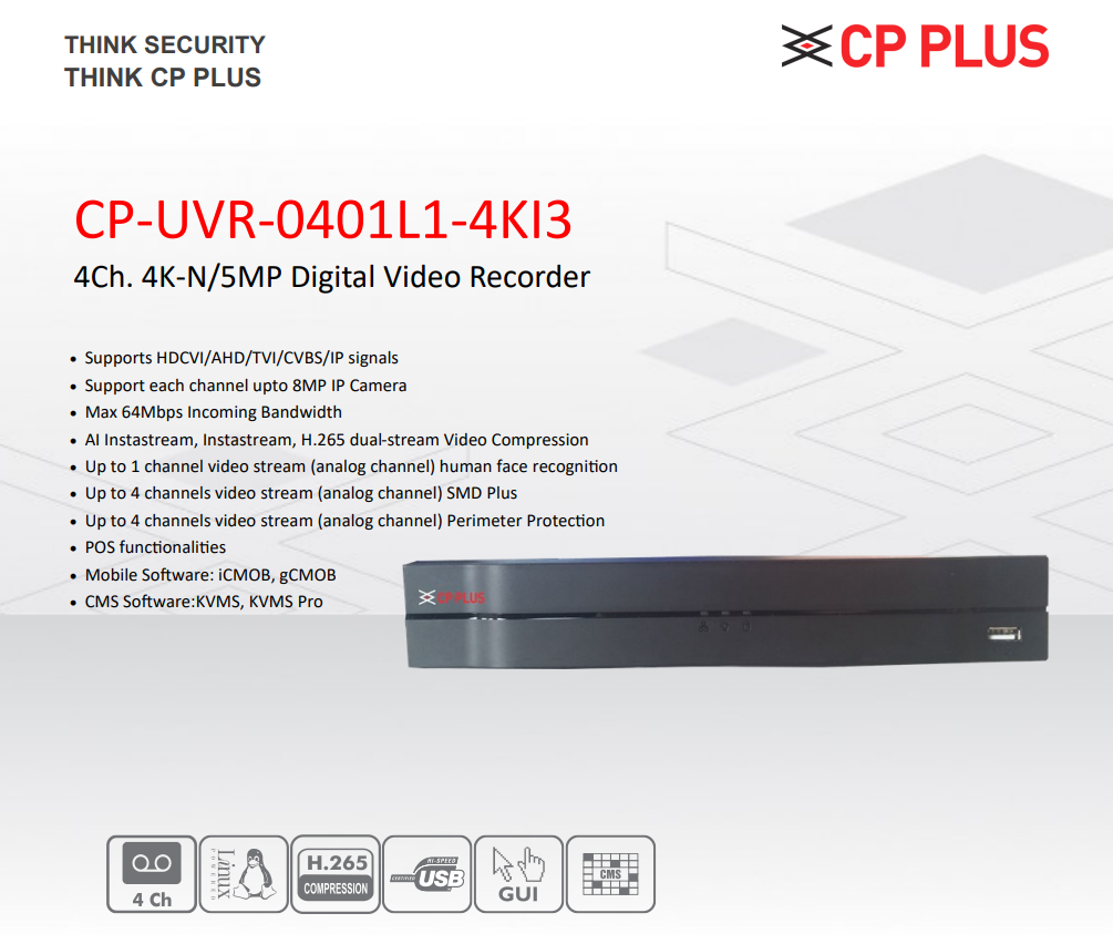 The CP PLUS CP-UVR-0401L1-4KI3 is a cutting-edge 4-channel 4K-N5MP Digital Video Recorder designed for high-performance IP video surveillance, integrating advanced deep learning AI technology. This sophisticated DVR supports multiple video formats including HDCVI, AHD, TVI, CVBS, and IP signals, offering seamless compatibility and flexibility with up to 8MP resolution per channel. Powered by an industrial-grade processor and embedded Linux OS, this device delivers premium recording quality with H.265 dual-stream video compression that optimises bandwidth and storage.