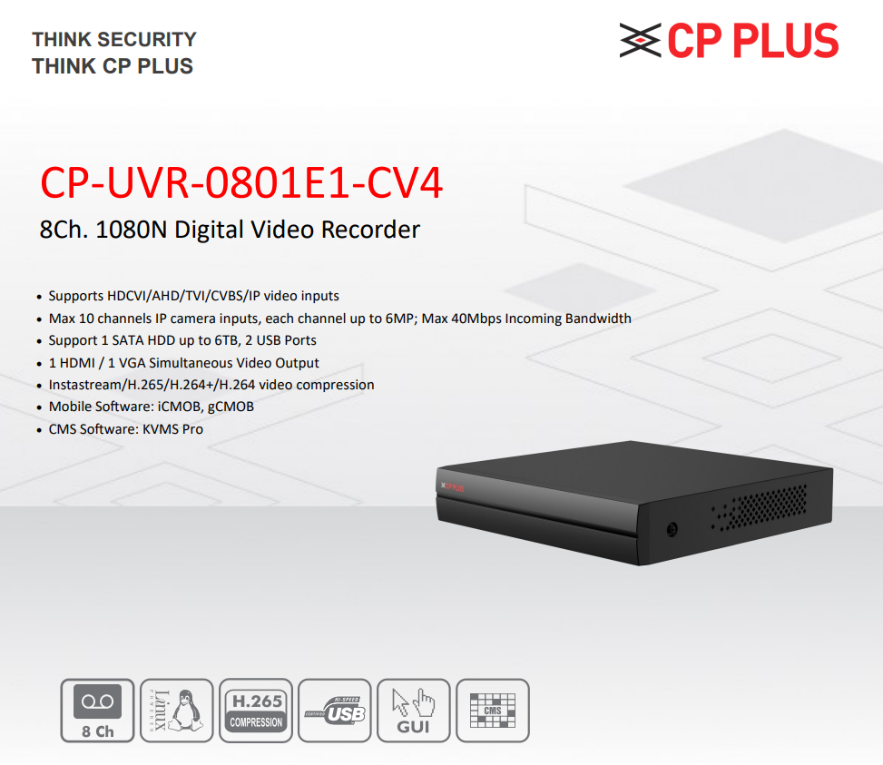 CP PLUS CP-UVR-0801E1-CV4 Featuring a user-friendly GUI interface, the system runs on an embedded Linux processor and includes mobile access through CP Plus’s gCMOB and iCMOB apps for remote monitoring. CP PLUS CP-UVR-0801E1-CV4 DVR’s compatibility with major protocols like ONVIF ensures integration with third-party cameras and systems. The unit supports 1 SATA HDD up to 6TB, 2 USB ports, HDMI and VGA outputs, and integrated CMS software (KVMS Pro).
