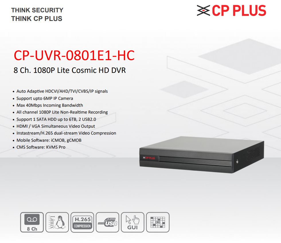Ideal for applications such as retail stores, home security, traffic monitoring, and more, the CP PLUS CP-UVR-0801E1-HC delivers reliable, high-definition video surveillance with ease of installation and operational simplicity.