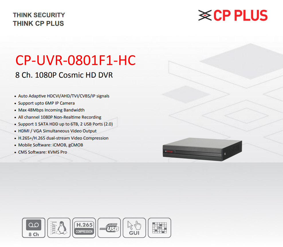 The CP PLUS CP-UVR-0801F1-HC Cosmic Series 8 Channel 1080P HD DVR represents the newest breakthrough in multi-format surveillance, designed to seamlessly connect with HDCVI, AHD, HDTVI, CVBS, and IP signals and provide the ultimate flexibility for advanced security setups. Engineered with a powerful embedded Linux processor and supporting up to 8 channels, including 6MP IP cameras, the CP PLUS CP-UVR-0801F1-HC DVR elevates real-time monitoring with up to 48 Mbps incoming bandwidth and all-channel 1080P non-realtime recording.
