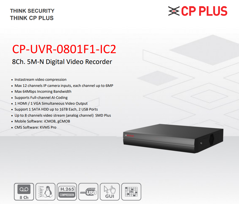 The CP PLUS CP-UVR-0801F1-IC2 8-Channel 5M-N Digital Video Recorder is a high-performance surveillance solution designed to deliver advanced video security with precision and reliability. Equipped with cutting-edge AI coding and InstaStream video compression technology, this DVR efficiently minimises bandwidth and storage usage while maintaining superior video clarity. The CP-UVR-0801F1-IC2 supports up to 12 IP camera inputs (up to 6MP each) with a maximum incoming bandwidth of 64 Mbps, ensuring seamless monitoring and recording. Its embedded LINUX operating system and industrial-grade processor provide long-term stability for continuous 24/7 operation.