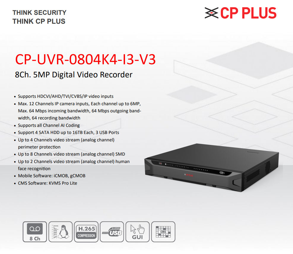 Multi-signal auto-adaptation empowers seamless upgrades without manual input, while mobile and CMS software support allows you to monitor and manage footage from anywhere. Featuring up to 4 SATA HDDs (16TB each) and 3 USB ports, this model is built for scalable, uninterrupted recording and storage. The CP PLUS CP-UVR-0804K4-I3-V3 makes surveillance smarter, simpler, and highly reliable for critical safety needs.​