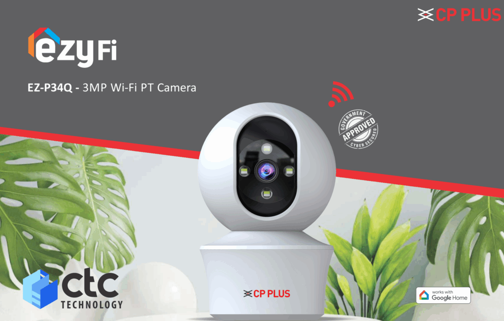 CP Plus EZ-P34Q 3MP indoor PT camera offers full‑color night vision (15‑20m) plus IR night vision (20‑30m), a built‑in siren, 342° pan / 60° tilt, and two‑way audio. With 3MP clarity, H.265 compression, and Google Home support, it delivers smart, reliable monitoring.