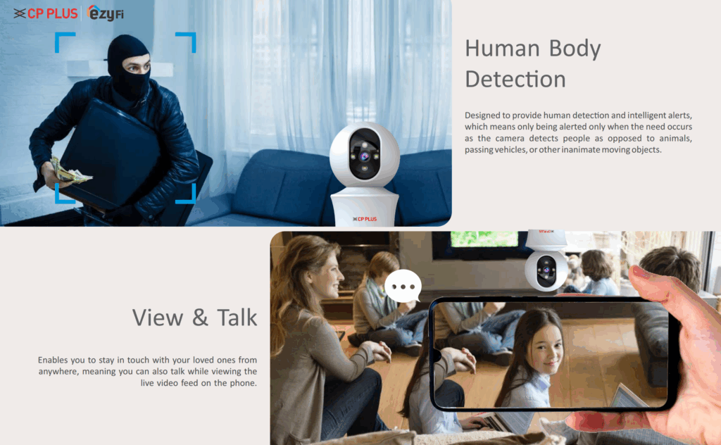 The CP Plus EZ-P34Q is a fully‑featured 3‑megapixel indoor Wi‑Fi pan‑tilt camera designed to deliver detailed monitoring and active security for your home. It captures sharp 2304 x 1296 resolution video at 15 frames per second, utilizing efficient H.265 compression to minimize bandwidth and storage usage. CP Plus EZ-P34Q motorized base provides extensive coverage with 342‑degree horizontal pan and 60‑degree vertical tilt, allowing you to remotely control the viewing angle and eliminate blind spots.