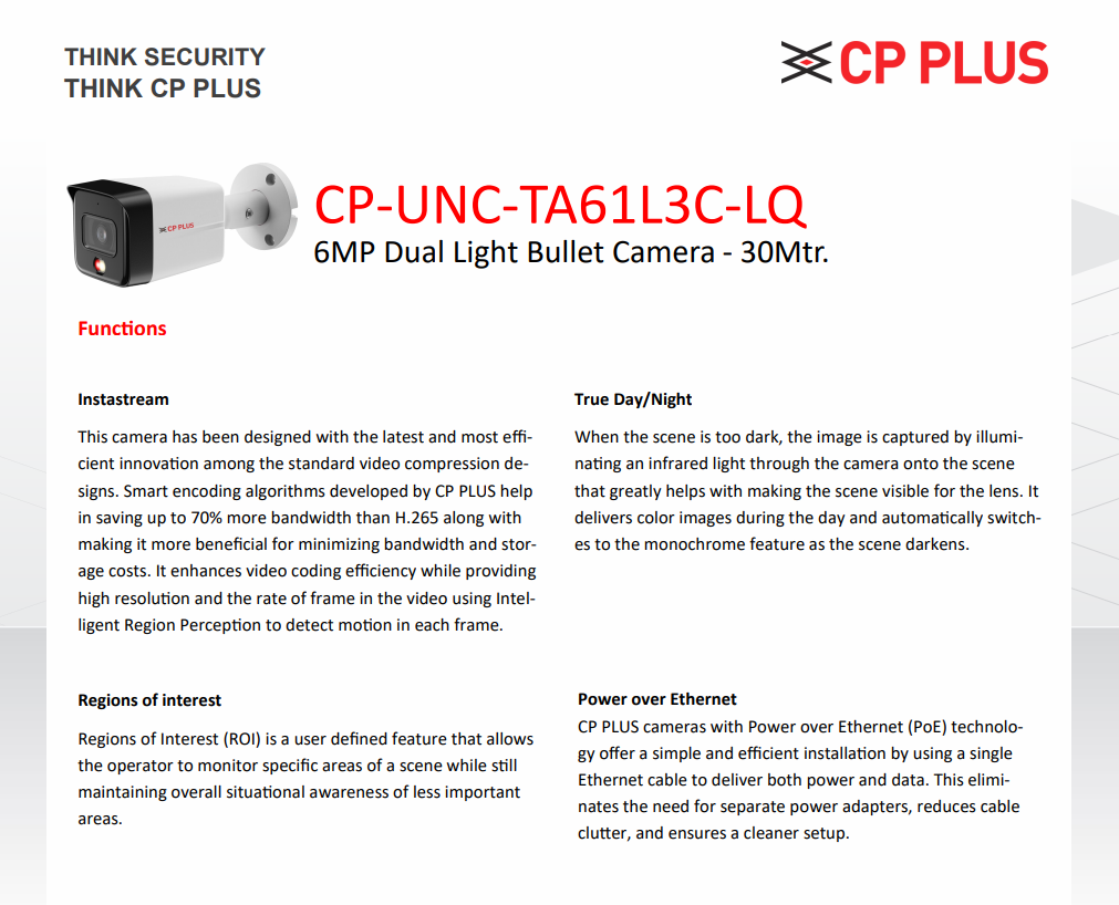Crystal-Clear Intelligence:Â With advanced models featuring starlight sensors, AI-based human/vehicle detection, and high-resolution imaging, CP Plus provides not just footage, but actionable insights for proactive security.