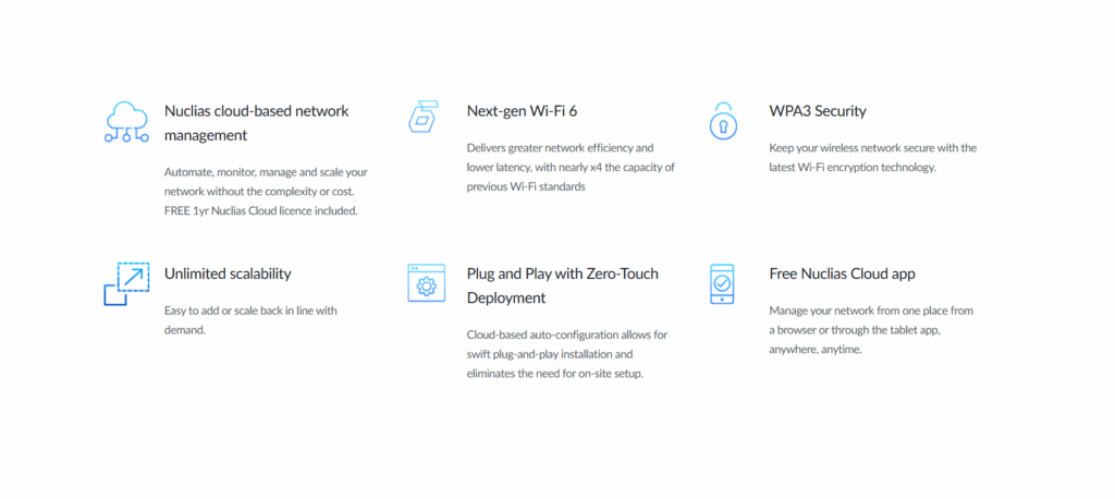 ManagementNuclias Cloud centralized management Over-the-air firmware upgrades