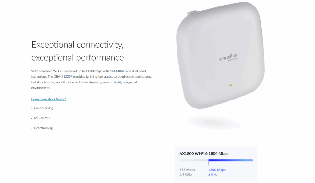 D-Link DBA-X1230P — Powerful Nuclias AX1800 Wi-Fi 6 Cloud-Managed Access Point with Zero Touch Deployment, MU-MIMO