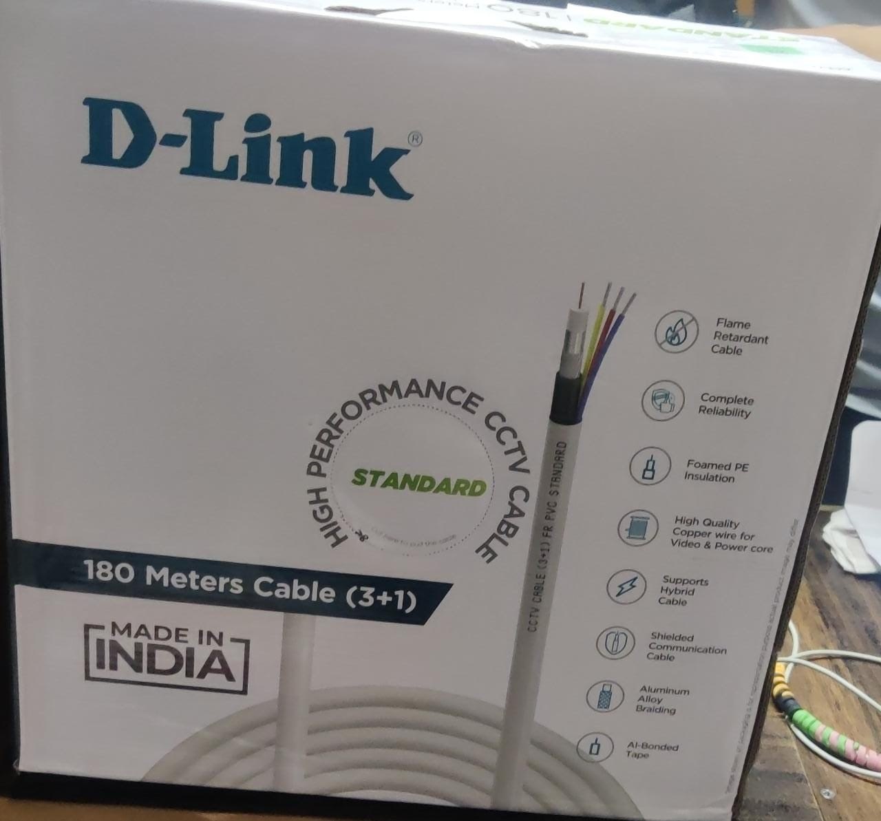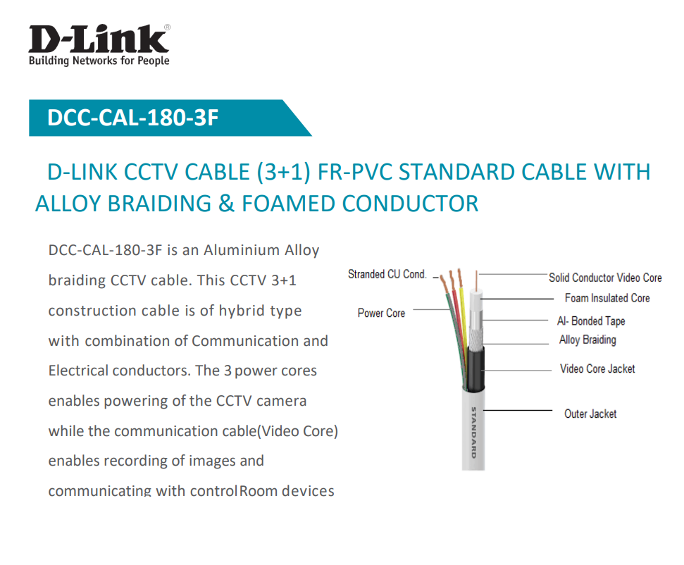 The D-Link DCC-CAL-180-3F is a high-performance hybrid CCTV cable engineered for reliable video and power transmission. Featuring aluminium alloy braiding, flame retardant FR-PVC outer jacket, and foamed PE insulation, it ensures excellent signal quality and safety. This cable supports three power cores for CCTV camera powering and a communication video core for smooth image recording and control room communication.