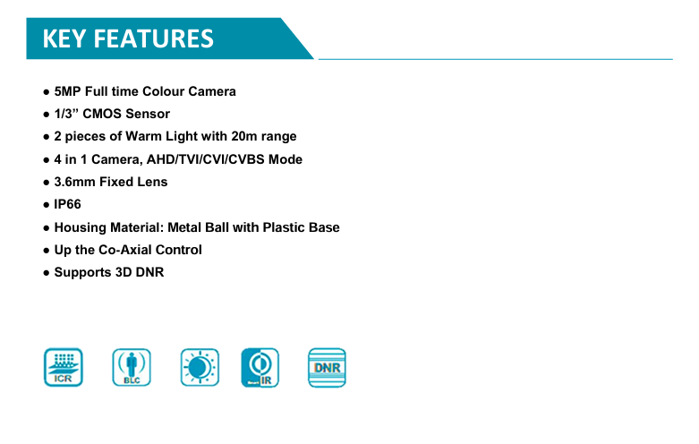 Up-the-Coaxial (UTC) Control allows for remote camera settings adjustments, while 3D Digital Noise Reduction (DNR) enhances image clarity in low-light environments. The metal ball design with a plastic base provides durability and easy installation, making it ideal for residential, commercial, and industrial security applications.