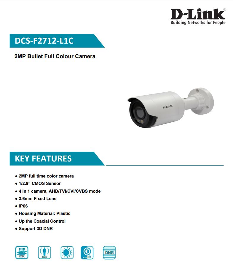 D-Link DCS-F2712L1C | 2MP Bullet Full Color Camera | AHD/TVI/CVI/CVBS Mode | 3.6mm Fixed Lens | Up the Coaxial Control | 3D DNR Support