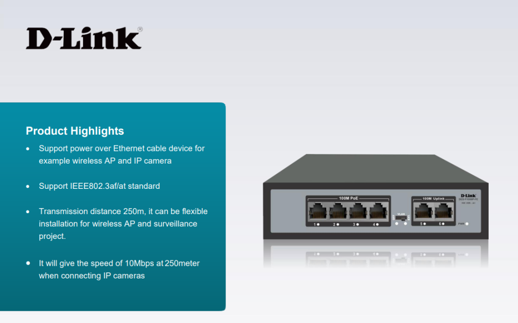 Whether you’re building a compact IP surveillance system or expanding an office LAN, the DES-F1006P-FE provides a reliable, efficient, and cost-effective PoE networking solution.