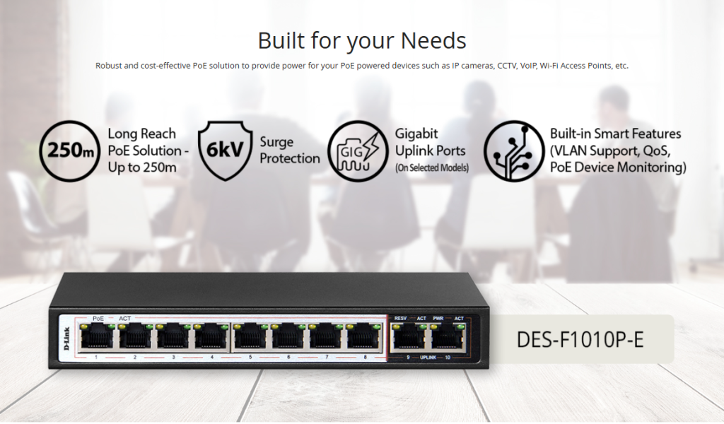 Ideal for IP camera surveillance, VoIP communications, and small business networks, the D-Link DES-F1010P-E provides stable, long-range PoE connectivity with smart features for an optimized networking experience