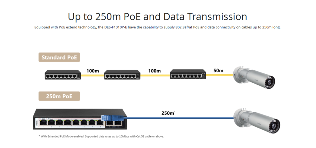 D-Link DES-F1010P-E is Equipped with PoE extend technology, the DES-F1006P-E have the capability to supply 802.3af/at PoE and data connectivity on cables up to 250m long.