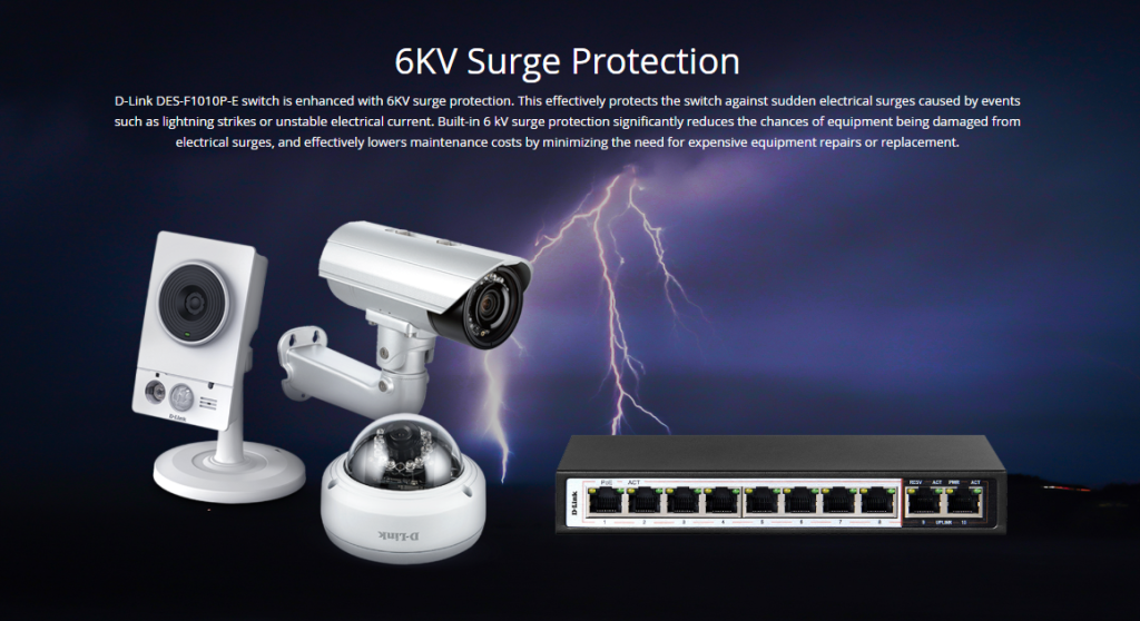 D-Link DES-F1006P-E switch is enhanced with 6KV surge protection. This effectively protects the switch against sudden electrical surges caused by events such as lightning strikes or unstable electrical current. Built-in 6 kV surge protection significantly reduces the chances of equipment being damaged from electrical surges, and effectively lowers maintenance costs by minimizing the need for expensive equipment repairs or replacement.