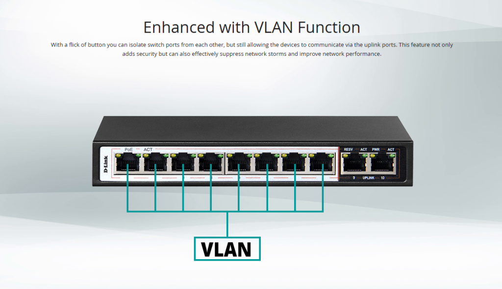 D-Link DES-F1006P-E comes with a flick of button you can isolate switch ports from each other, but still allowing the devices to communicate via the uplink ports. This feature not only adds security but can also effectively suppress network storms and improve network performance.