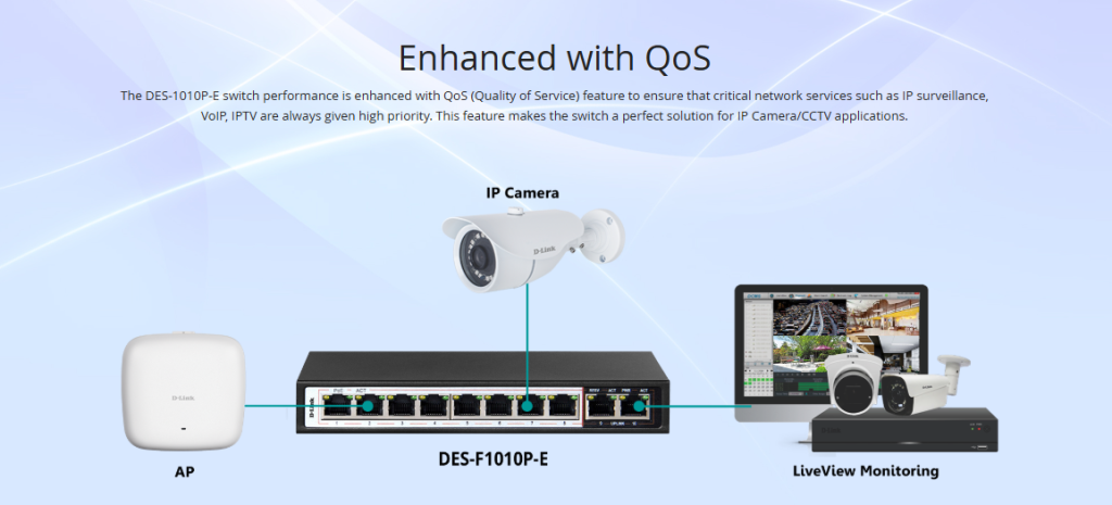 The DES-1006P-E switch performance is enhanced with QoS (Quality of Service) feature to ensure that critical network services such as IP surveillance, VoIP, IPTV are always given high priority. This feature makes the switch a perfect solution for IP Camera/CCTV applications.