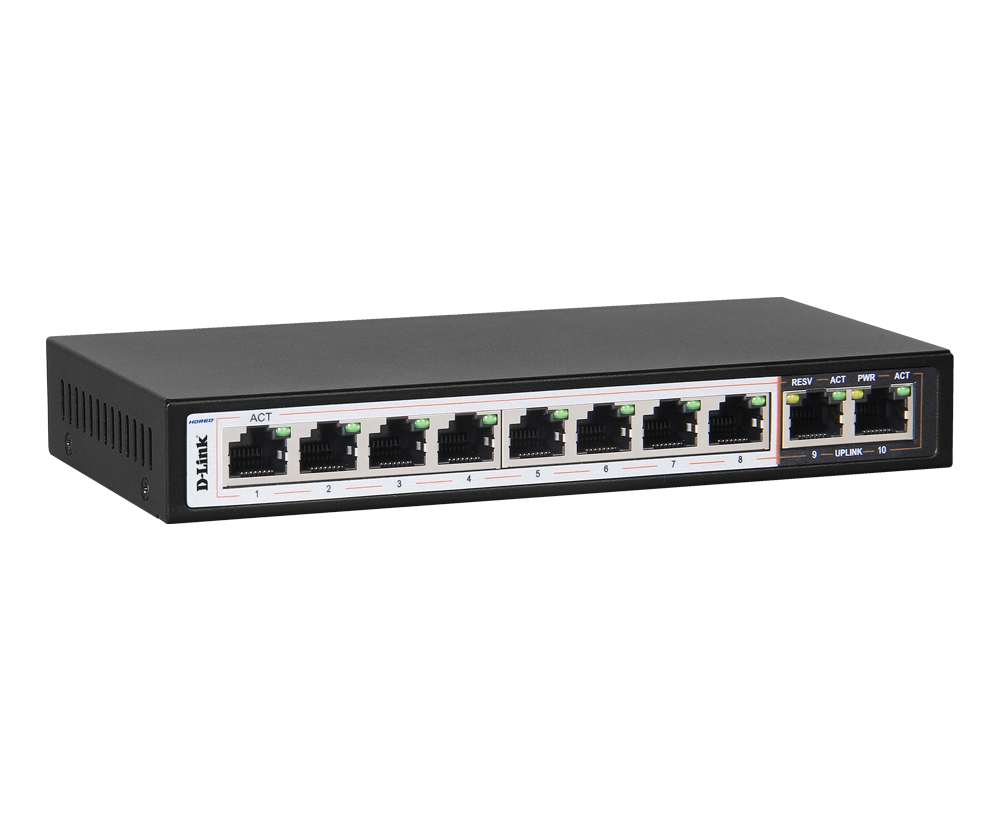 DGS-F1010P-E10 Ă— Gigabit8 PoE2 Uplink120WHigh-bandwidth CCTV and networking