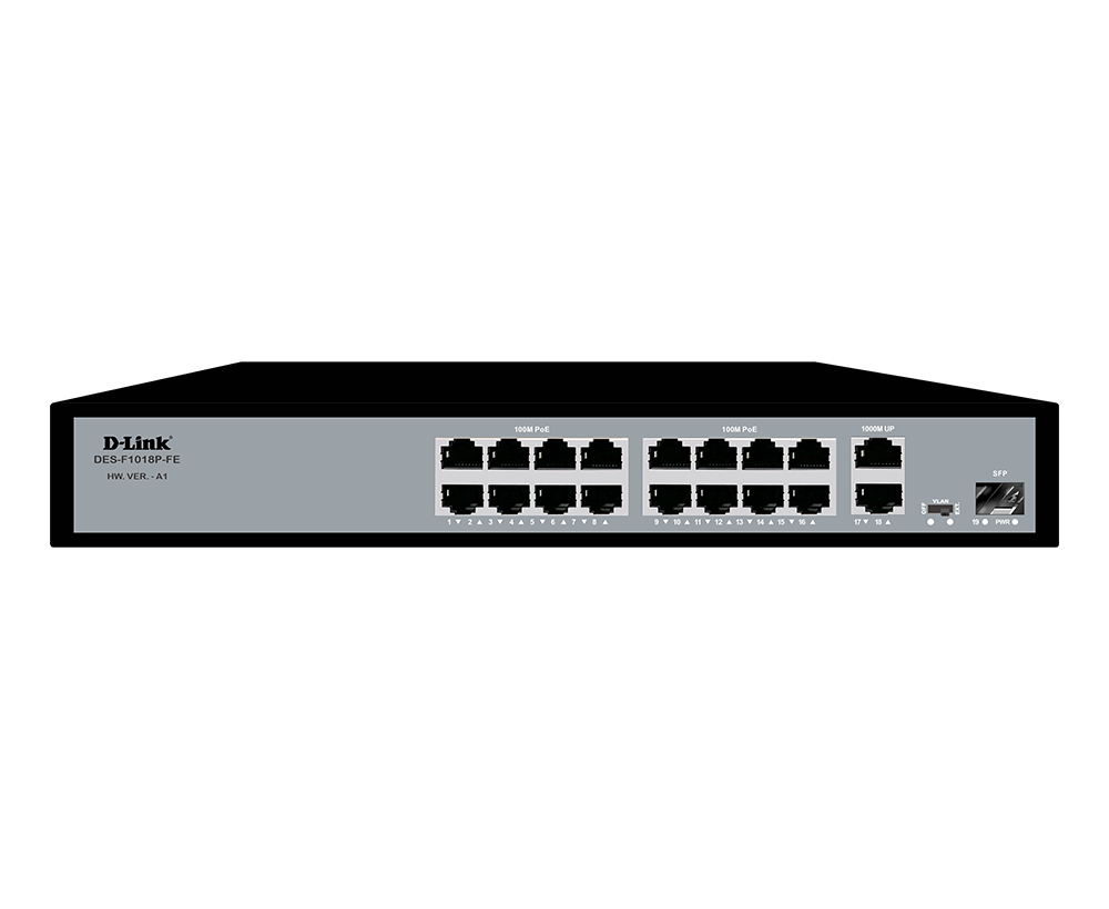 DES-F1018P-E18 Ă— 10/100Mbps16 PoE2 Uplink150WLarge CCTV deployments